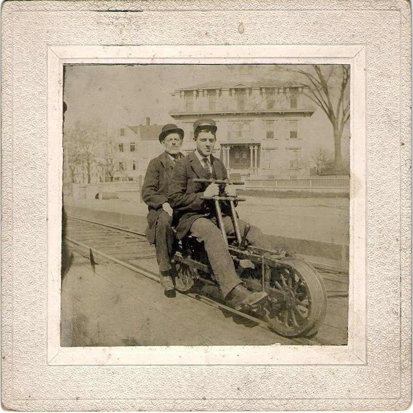 [This is not a photo of Caseus and Bert. It’s titled “1900s Southern Pacific Co Railway Velocipede Inspection Car” from The Online Bicycle Museum website. www.onlinebicyclemuseum.co.uk/1900s-southern-pacific-co-railway-velocipede-inspection-car]