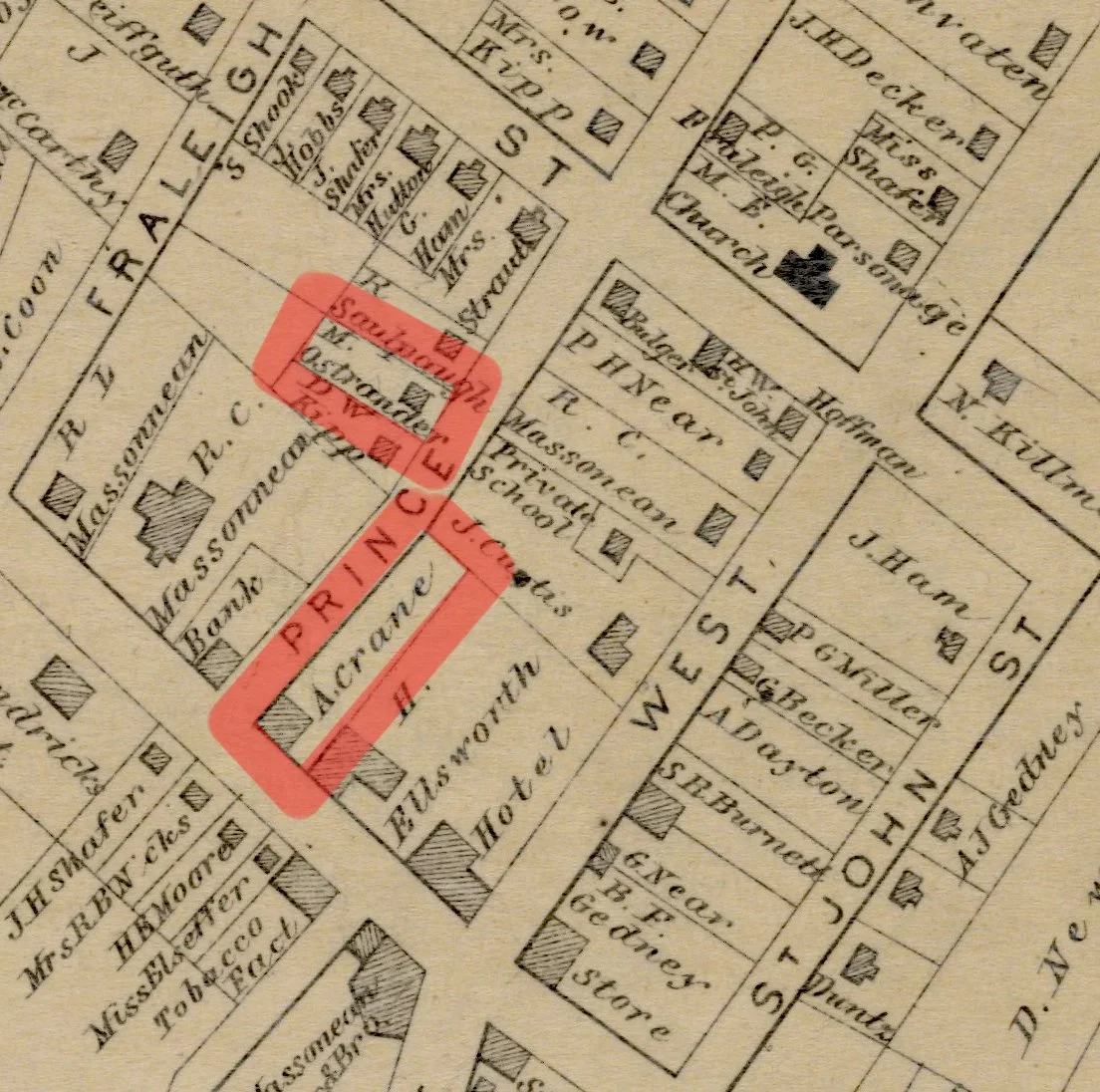1876 Red Hook map detail. “M. Ostrander” is marked on Prince between D.W. Kipp and R. Saulpaugh. The saloon might be where it’s marked “A. Crane” on Broadway on the corner of Prince where the parking lot is now.