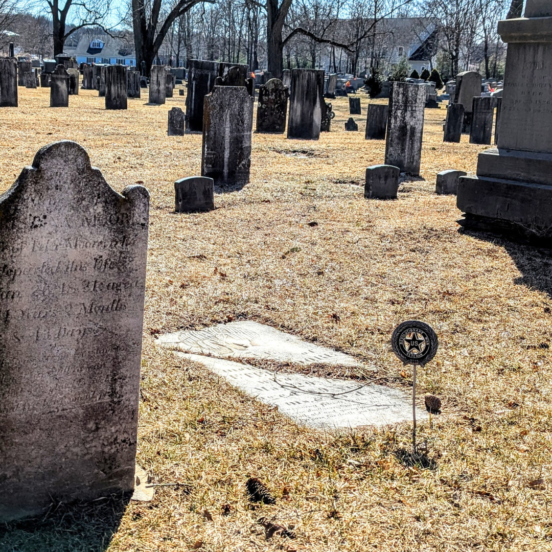 St. Paul’s Lutheran Cemetery, Red Hook. Marble tablet, fallen face up and broken in half marked with an SAR medallion, front row to the left of the cemetery sign.